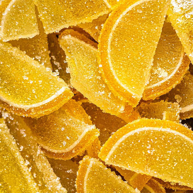 In Zucker eingelegte Zitronenscheiben verströmen eine helle, kristalline Süße mit einem Hauch feiner Zitruszeste. Der Duft sprüht vor zitrischer Energie und bewahrt zugleich eine sanfte, kandierte Fülle – wie Sonnenlicht, das durch bernsteinfarbenes Glas scheint.
